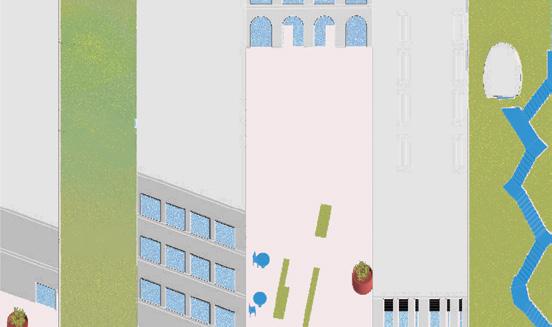 Ground perspective view of the public plaza and its different activation element.