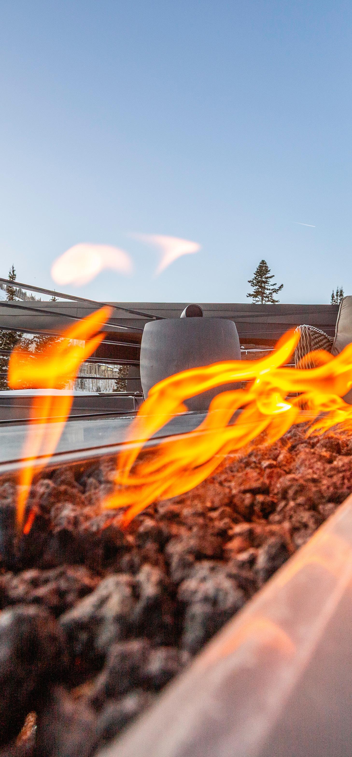 The dining room is where mountain mornings begin over a slow breakfast and evenings gather around candlelight and conversation. Framed by retractable glass walls that blur the line between indoors and nature, this space lives in harmony with the outdoors. A see-through fireplace flickers warmly at the center, casting light on every meal and turning every gathering into an occasion.