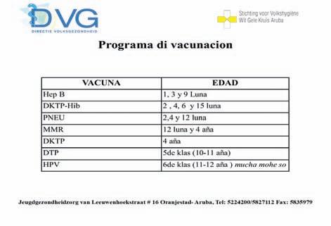 ARUBA- 12.09.2024. Departamento di Salud Publico pa medio di su seccion Cuido Salud Hubenil (Jeugdgezondheidszorg) ta encarga cu vacunacion di nos muchanan na Aruba. E programa di vacunacion Nacional ta wordo maneha pa Seccion Cuido Salud Hubenil y ta cuminsa for di baby na consultorionan di Wit Gele Kruis unda dokternan di seccion Cuido Salud Hubenil ta controla desaroyo y ta vacuna nos muchanan te cu edad di 4 aña. Despues di 4 aña e mucha su desaroyo y skema di vacunacion ta sigui wordo monitor pa Seccion Cuido Salud Hubenil na scol preparatorio y basico. E vacunanan cu Seccion Cuido Salud Hubenil ta provee na nos muchanan ta e vacunanan regular DKTP, MMR y Hep B y desde algun aña a introduci e vacuna di HPV. E vacuna di DKTP ta proteha contra malesanan Difteria,Pertusis(Kinkhoes t),Tetanus y Polio. E vacuna di MMR ta proteha contra e malesanan Sarampi, Cacheton y Sarampi Aleman. E vacuna di Hep B ta proteha contra Hepatitis B y e vacuna di HPV ta proteha contra