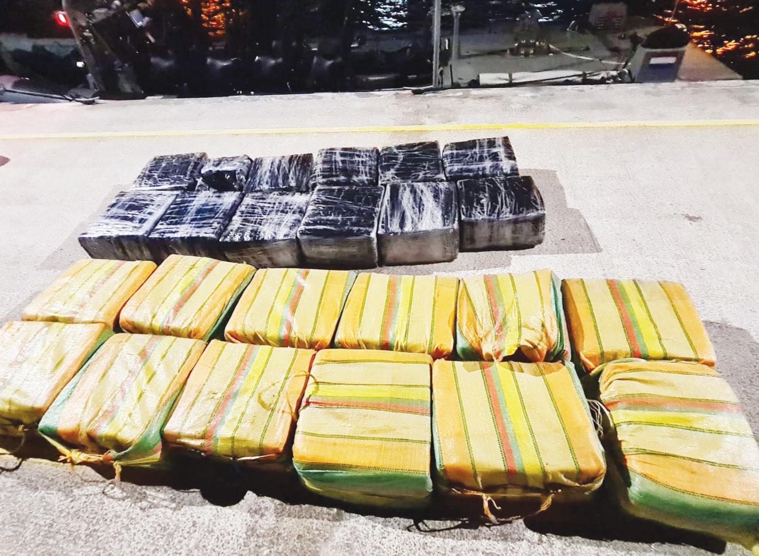 E sospechosonan a benta un parti di e contrabanda den lama. E paketenan aki despues a keda saka for di den lama pa un di e botonan di interceptacion rapido. E peso completo di e paketenan a yega na mas o menos 850 kilo di cocaina. Zr.Ms.