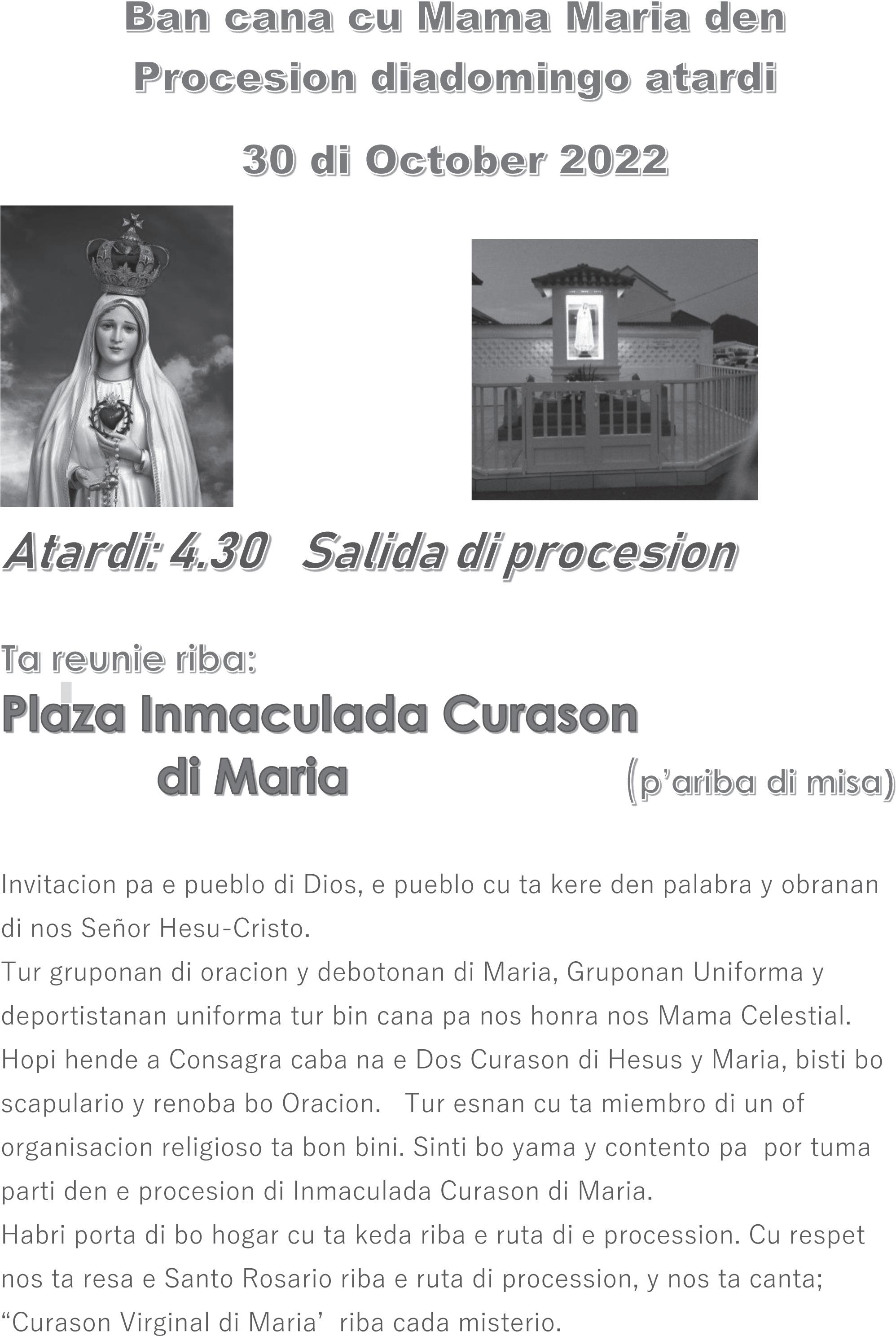 Pa 6.00 p.m. nos ta resa e Santo Rosario na honor di Mama Maria pa bendicion pa nos dushi Aruba, pa mundo henter cu ta pasando den un crisis financiero i pa crecemento di fe, combercion di pecadornan i paz mundial.