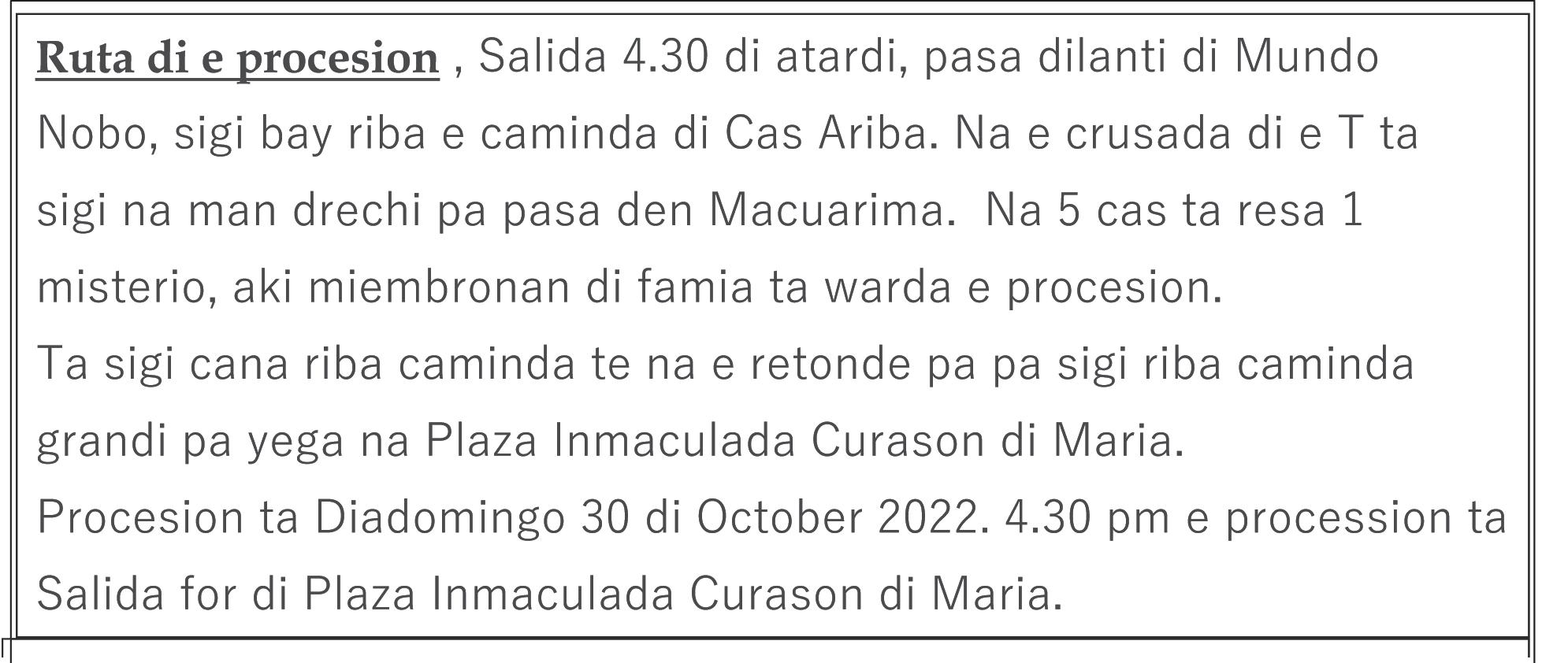 Ta bolbe ripiti cu: Fiesta di San Hudas Tadeo, conhuntamente cu San Simon, lo ser celebra diabierna 28 di october 2022 cu un Santo Sacrificio di Misa Solemne pa 7 or di anochi. Nos kier a enfatisa si cu lo tin un Santo Rosario na nos Reina di Santisimo Rosario, nos Mama Maria, como ta luna di October, pa 6 or y 15 p.m. prome cu e Santo Sacrificio di Misa.