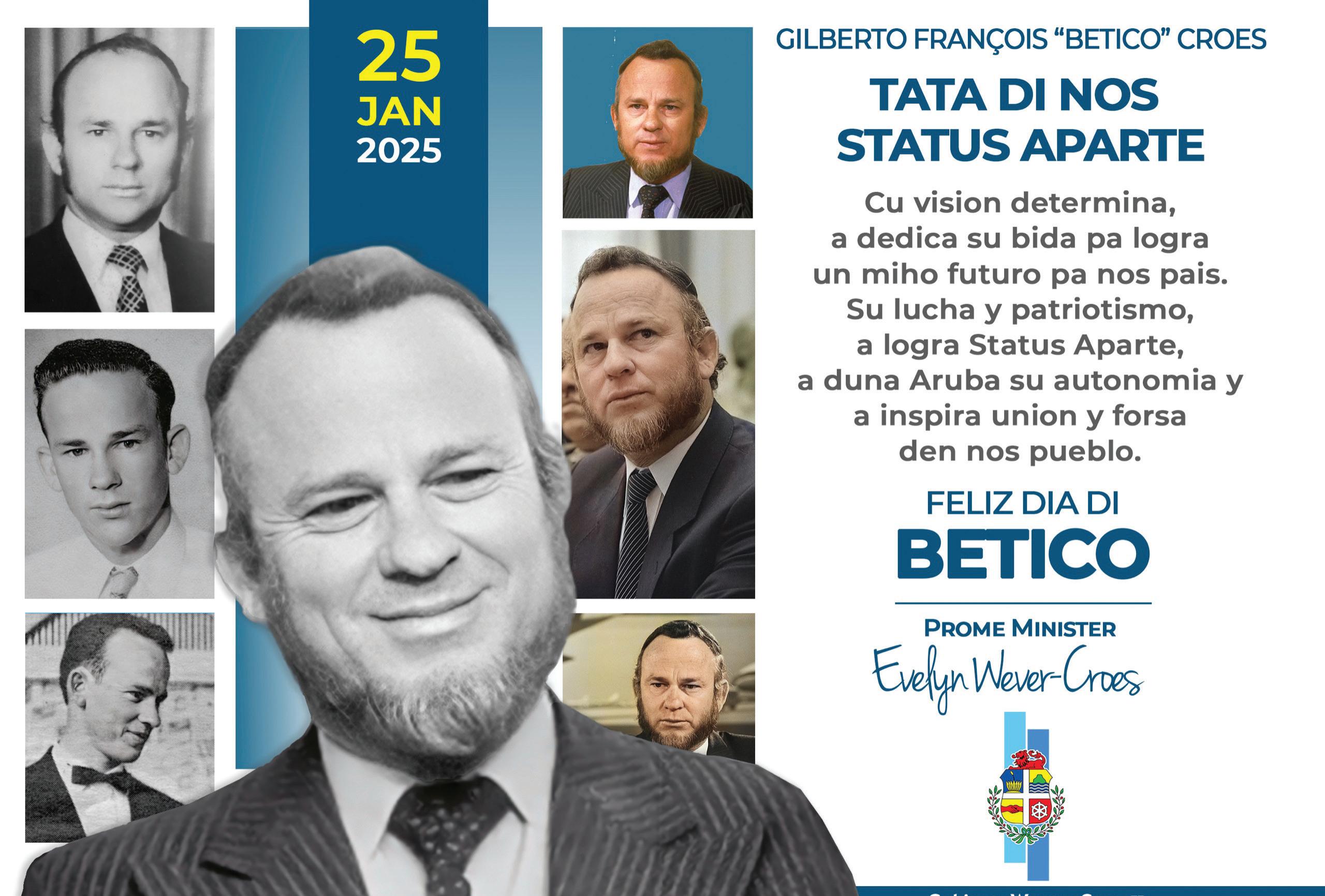 Falta dos dia pa 25 di januari, Dia di Betico, y desde varios aña, Prome Minister Evelyn WeverCroes ta bishita scolnan na Aruba en conexion cu e dia aki. Pa e fecha special aki, scolnan na Aruba ta prepara alumnonan dunando informacion di e bida y logro di e gran politico, lider, estadista y Libertador Arubiano, señor Gilberto François ‘Betico’ Croes.