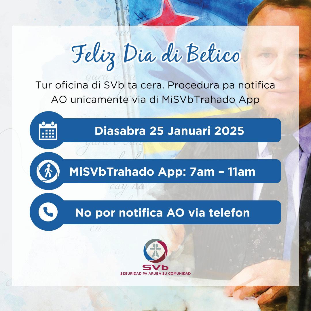 24 di januari 2025: En conexion cu Dia di Betico, lo no tin sorteo di merdia y anochi di Lotto, E Loteria di Aruba ariba diasabra 25 di januari. Sorteo di Lotto ta sigui normal ariba diadomingo 26 di januari cu weganan di merdia cu ta hunga 2or y benta ta sera 1:45PM.