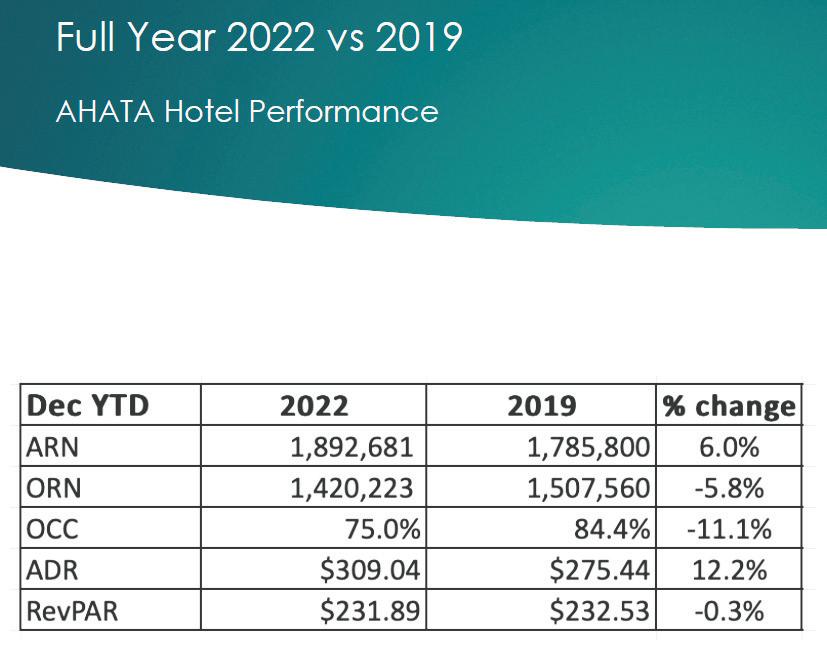 1 December, 2022: Aruba Hotel & Tourism Association (AHATA) ta acumula e cifranan di ocupacion y prijs di hotelnan tur luna, y CEO di AHATA, Tisa LaSorte, ta raporta cu luna di December tabata mas exitoso na 2022 cu na 2019. Mientrastanto, e cifranan averahe pa aña 2022 ta indica cu ocupacion di hotel tabata menos cu na 2019, pero e RevPAR a recupera completamente. Pa motibo cu por cobra prijs mas halto pa camber desde pandemia, a logra casi mesun RevPAR cu na 2019. DECEMBER 2022:
