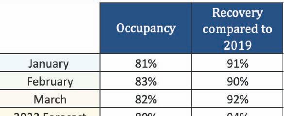 • Ocupacion: E ocupacion averahe pa ful aña 2022 tabata 75%; un recuperacion di 89% compara cu 2019.