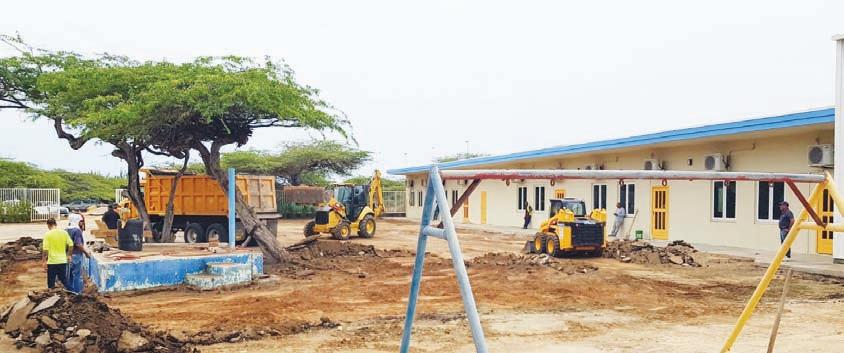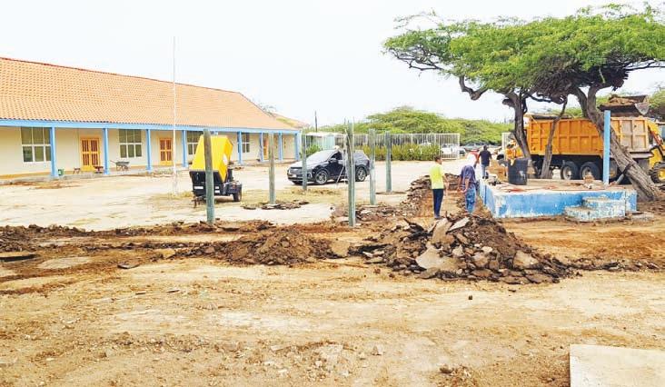 E siman aki, DOW a inicia cu e trabou pa renobacion di e speelplaats di Sint Aloysius School na Noord. Esaki ta e ultimo parti di e proyecto di renobacion di e scol. Manera ta conoci, na momento cu awa yobe e speelplaats aki tabata haya un plas grandi di awa. Pues, DOW mester a traha un plan pa nivela e haltura y saca e awa banda di pariba y conecta esaki riba un rooi existente pa por drecha e parti aki cual tabata duna hopi problema. Lo ranca e asfalt existente pa despues egalisa e fundeshi.