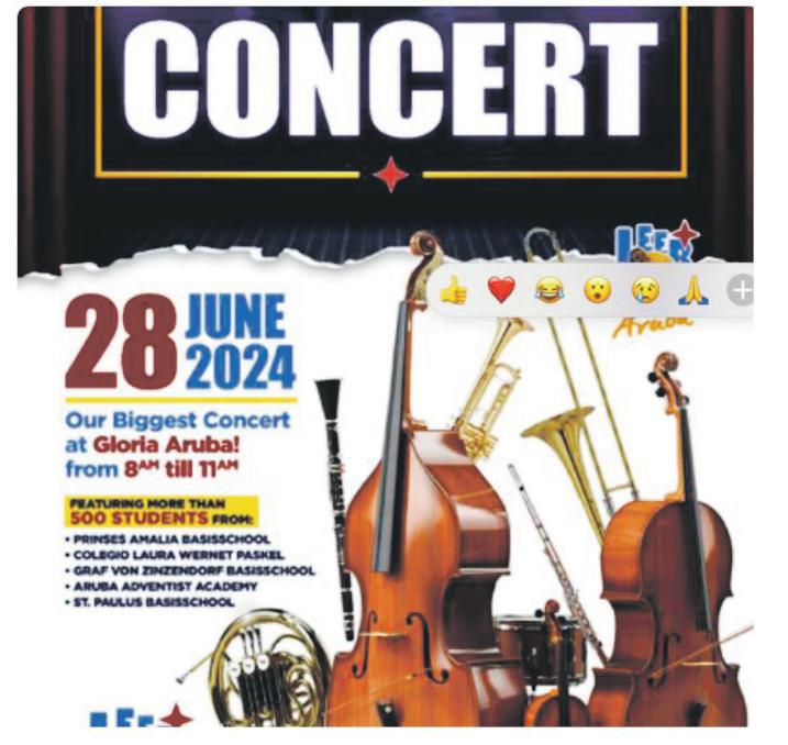 Na e momento cu mi a mira e anuncio di e concert di Leerorkest Aruba diabierna 28 di Juni mi a keda masha contento. Como mi tabata participante di fundacion di e organizacion, mi ta content cu e directiva a sigi cu e trabau dificil di desaroya Leerorkest Aruba