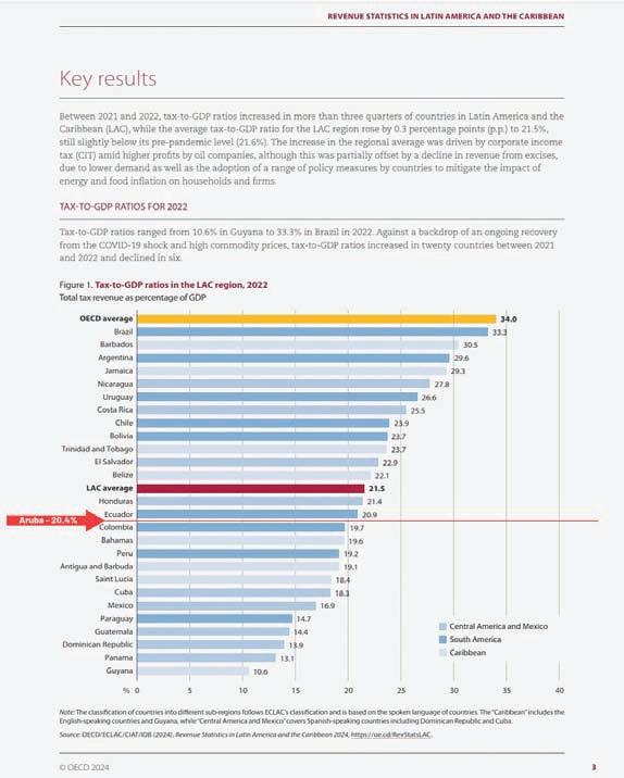 Peso fiscal na Latino America y Caribe E mandatario a sigui splica cu OECD cu ta e autoridad riba tereno fiscal internacional, a publica cu pa aña 2024 e peso fiscal pa paisnan den e region Latino Americano y den Caribe, ta na un promedio di 21,5%. Esaki ta demostra cu e peso fiscal di Aruba cu ta rond di 20%, ta cay bou di e promedio di peso fiscal den nos region. Pues