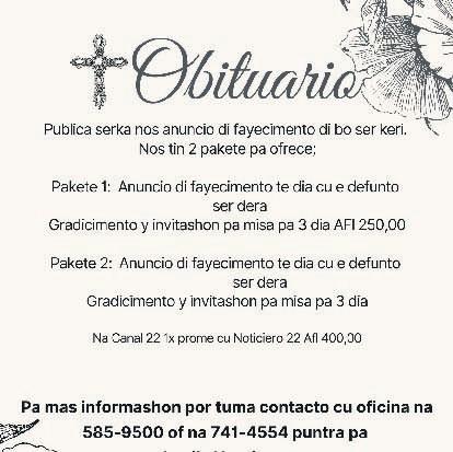 Demas Famia: Angela, Kock, Trimon, Bislip, Maduro, Rasmijn, Thode, Wester y demas famia ta wordo invita pa condolencia y acto di entiero Diasabra 29 di juni 2024 for di 2 pm pa 4 pm na Royal Funeral Home y despues lo Sali bai pa santana Catolico na Sta. Cruz.