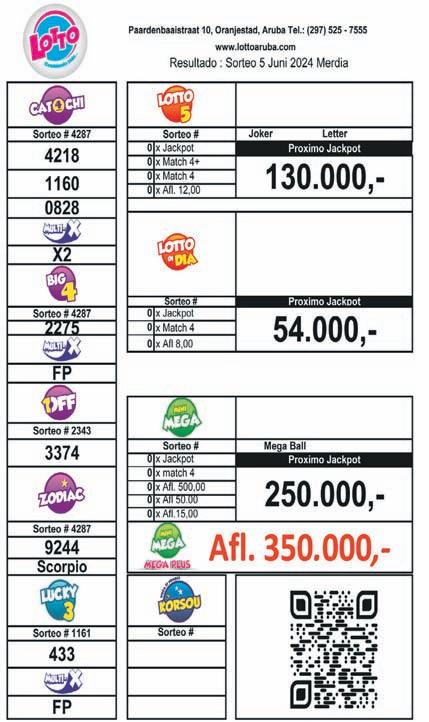 Lotto, E Loteria di Aruba tin diferente wega, Catochi, Big 4, 1-OFF, Zodiac, Wega di Number di Korsou di Lotto, Lucky 3, Multi-X, Lotto di Dia, Lotto 5, Mini Mega y cu su Mega Plus