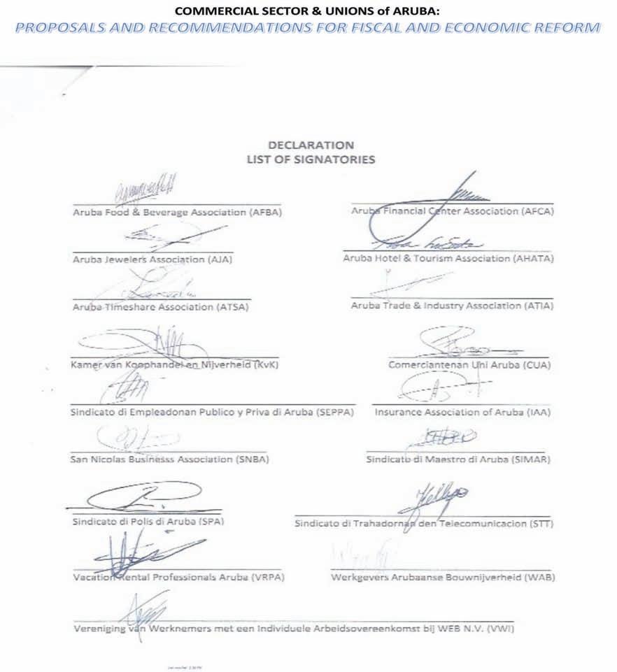 Association (AJA), Kamer van Kamer van Koophandel (KvK), Sindicato di Empleadonan Publico y Priva di Auba (SEPPA), San Nicolas Business Association (SNBA), Sindicato di Polis di Aruba (SPA), Vacation Rentals Professionals Aruba (VRPA) Vereneging van Werknemers met een Individuele Arbeidsovereenkomst bij WEB N.V. (VWI), Aruba Financial Center Association (AFCA), Aruba Hotel and Tourism Association (AHATA), Aruba Trade & Industry Association (ATIA), Comerciantenan Uni Aruba (CUA), Insurance Association of Aruba (IAA), Sindicato di Maestro di Aruba (SIMAR), Sindicato di Trahadornan den Telecomunicacion (STT) y Werkgevers Arubaanse Bouwnijverheid (WAB).
