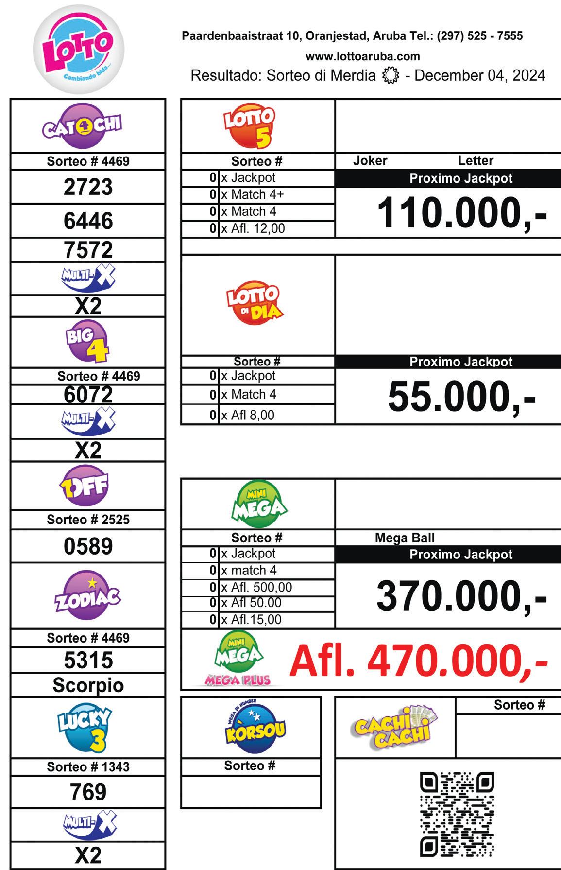 Diabierna 6 di december lo bay tin sorteo di Lotto merdia cu ta tuma lugar 2.30 PM y sorteo di anochi cu ta bira 7:00 PM, bo por cumpra bo weganan preferi di Lotto merdia te cu 2.15 PM y anochi te