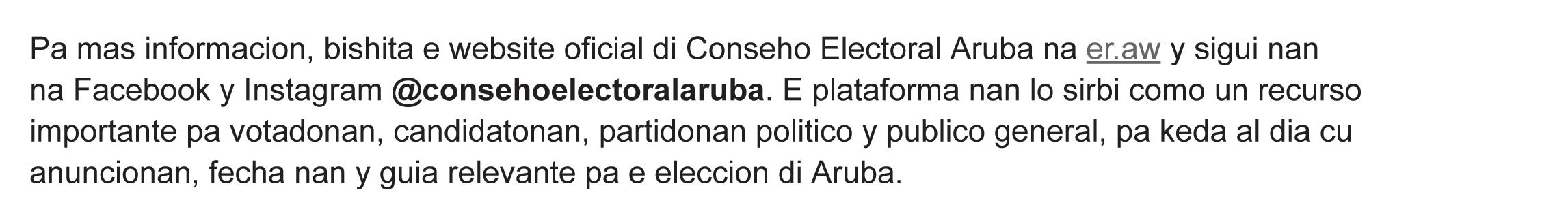 Eleccion no ta solamente un oportunidad pa scoge un lider. E ta un oportunidad pa scoge un direccion, pa determina ki tipo di Aruba nos kier sigui construi y ki tipo di Aruba nos lo laga pa mañan. P’esey bo voto ta un acto poderoso. E ta bo bos den e proceso di establece un mañan cu ta beneficia cada miembro di nos comunidad. Nos no por perde e oportunidad pa stima y proteha nos patria p’esey nos tin di sali y vota.