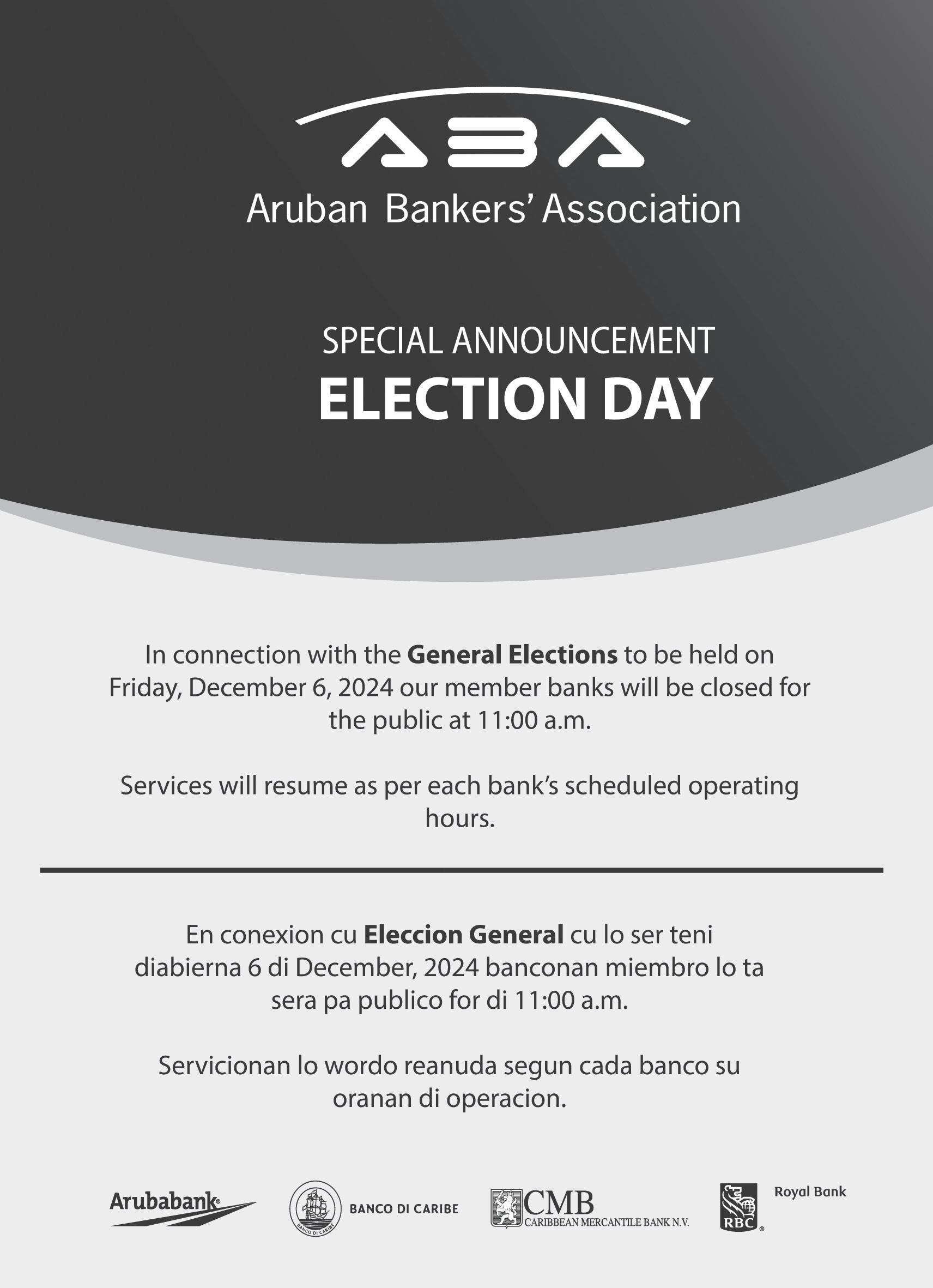 Lotto, E Loteria di Aruba kier a informa comunidad di Aruba ariba e orario adapta riba día di elección mañan díabierna 6 di december 2024.