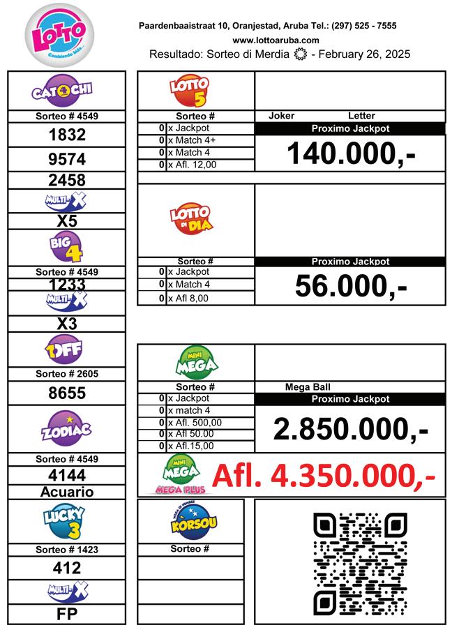 crece y pa diabierna 28 di februari e jackpot di Mini Mega y Mega Plus a bira un suma historico di 4 miyon 350 mil florin!