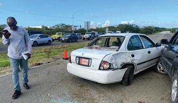 e rotonde un chauffeur biniendo for di Palm Beach a dicidi di bay dal un U-turn. E chauffeur di e Nissan Sentra a bay na e banda robes, baha caminda y subi e otro banda bay dal riba un Kia Sportage bayendo panort. Debi na e impacto e dama