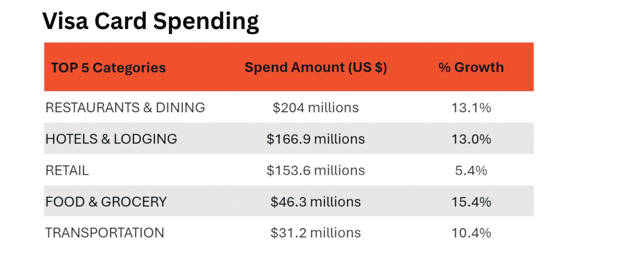 Den 2025, Restaurants & Dining a keda e categoria cu mas gasto, totalizando USD 204.4 miyon. Hotels & Lodging a sigui cu USD 166.9 miyon, y Retail cu USD 153.6 miyon. Food & Grocery (USD 46.3 miyon) y Transportation (USD 31.2 miyon) tambe a forma parti di gasto principal. Ademas, diferente regionnan ta mustra comportacion distinto: Estados Unidos y Canada ta gasta mas den dining y lodging, Europa ta dedica un porcion mas grandi na alohamento, y Latino America ta gasta na un manera mas balansa den retail, dining y grocery.