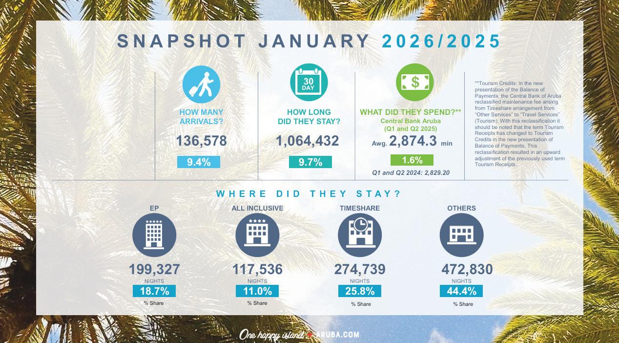 E panorama di turismo pa januari 2026 ta mustra un combinacion solido di yegadanan, estadia prolonga y un mescla amplio di mercado. Aruba a ricibi un total di 136.578 bishitante stayover, mientras cu e cantidad total di nochinan di estadia a yega 1.064.432, resultando den un promedio di estadia, esta Average Length of Stay (ALOS) di 7.8 anochi, un cifra cu ta refleha un nivel mas halto di compromiso y interaccion cu Aruba como destinacion.
