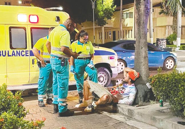 Diasabra madruga a drenta informe di cu tabata tin un turista pata pata burachi benta den e parkinglot banda di e hotzone na Palm Beach, mesora a dirigi tanto polis como ambulans na e sitio. Na yegada di e patruya a bin compronde cu ta nos damanan Arubiano a wak e y a brind’e ayudo, mesora a pidi ambulans cu a presenta manera un jet na e sitio y a yuda e turista. Manera e turista a bin bij ela gradici nos damanan Arubiano cu a tuma tempo pa bati alarma y yude. Ambulans a haya cu ta necesario pa hibe hospital y a haci esey.