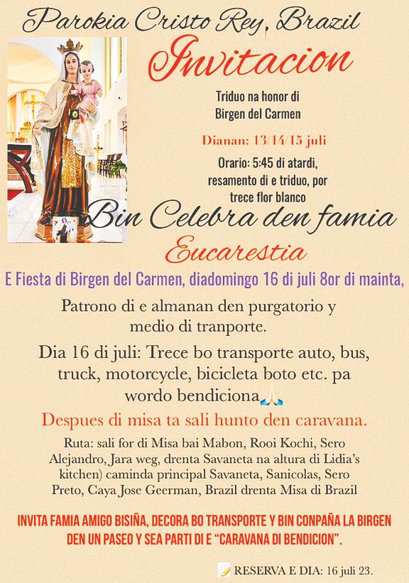 Riba 16 di juli 8:00 di mainta, dia cu ta celebra “Birgen del Carmen” patrona di e almanan den purgatorio y medio di transporte, ta invita bo cordialmente pa hunto den famia, cu colega y amistadnan bin celebra Santa Misa den nos Parokia Cristo Rey Brazil. Pastoor Andry ta duna un bendicion special y cada un ta ricibi un scapulario y un oracion pa semper bo(so) ta bon proteha ariba nos careteranan y riba lama. Esaki ta e oportunidad pa bendiciona tur medio di transporte ariba e mainta aki. Ta deseo y anhelo,