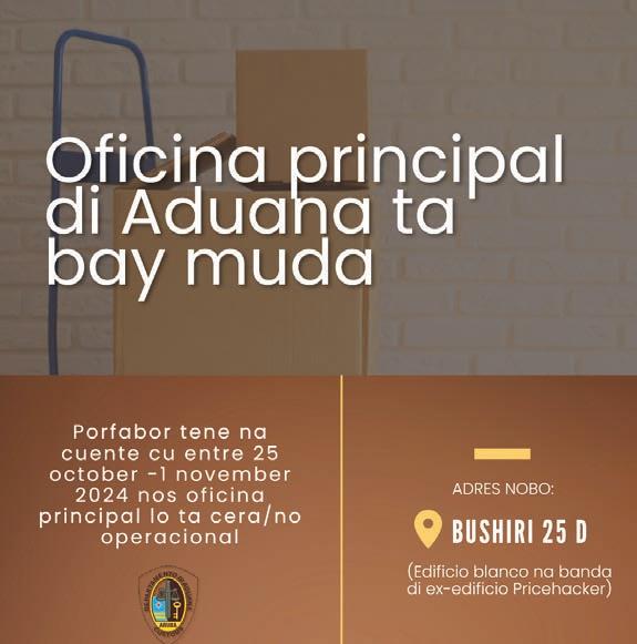 Departamento di Aduana ta informa cu nan oficina principal, actualmente situa na L.G. Smith Boulevard 134, lo ta den proceso di mudamento pa un localidad na Bushiri 25 D (banda di ex edificio Pricehacker), for di diabierna 25 di october te cu diabierna 1 di november 2024.