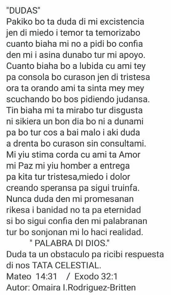 “Señor ta mi wardador, mi’n tin falta di nada. Den cunucu di yerba berde e ta ponemi sosega. E ta hibami na awa trankil, pa mi bolbe haña forsa”.