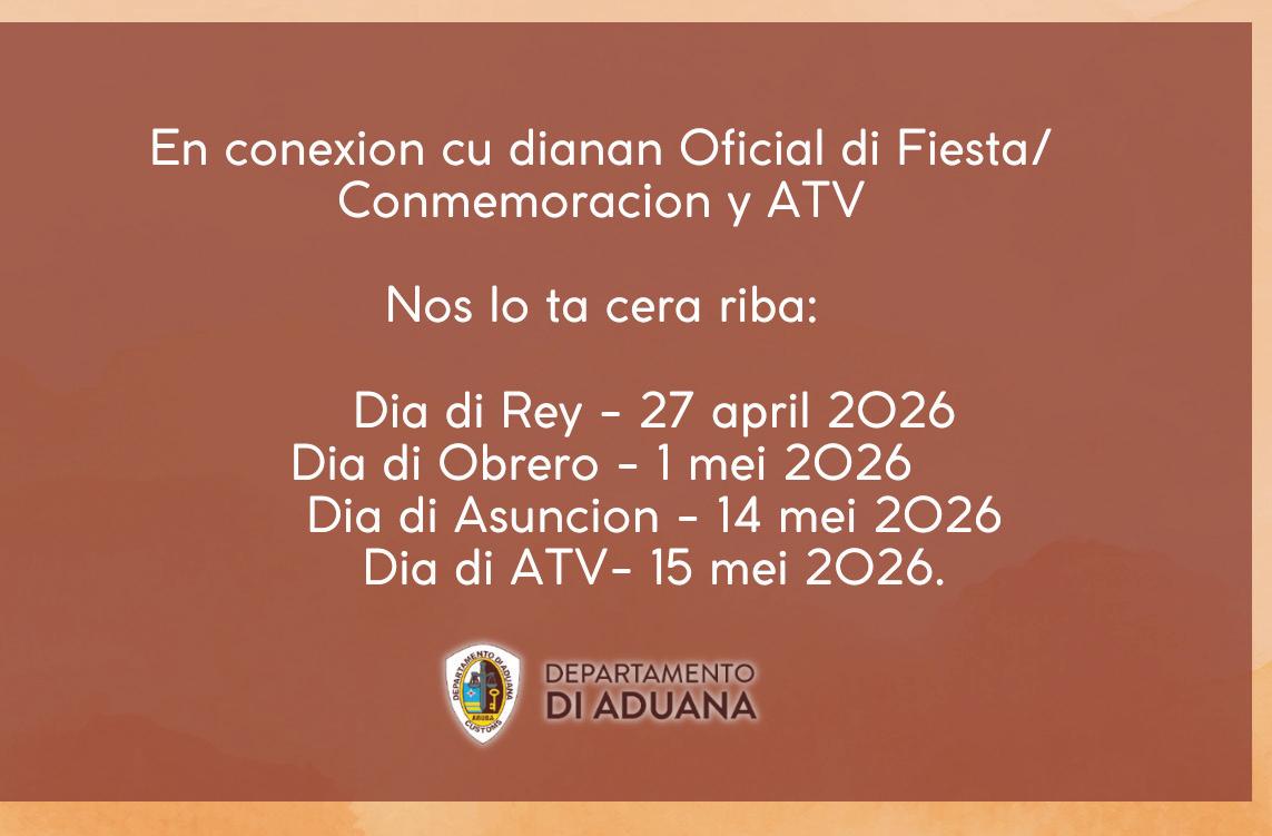 ORANJESTAD- Departamento di Aduana ta recorda tur cliente y publico general cu nan oficinanan lo ta cera riba e siguiente dianan di Fiesta/Conmemoracion: