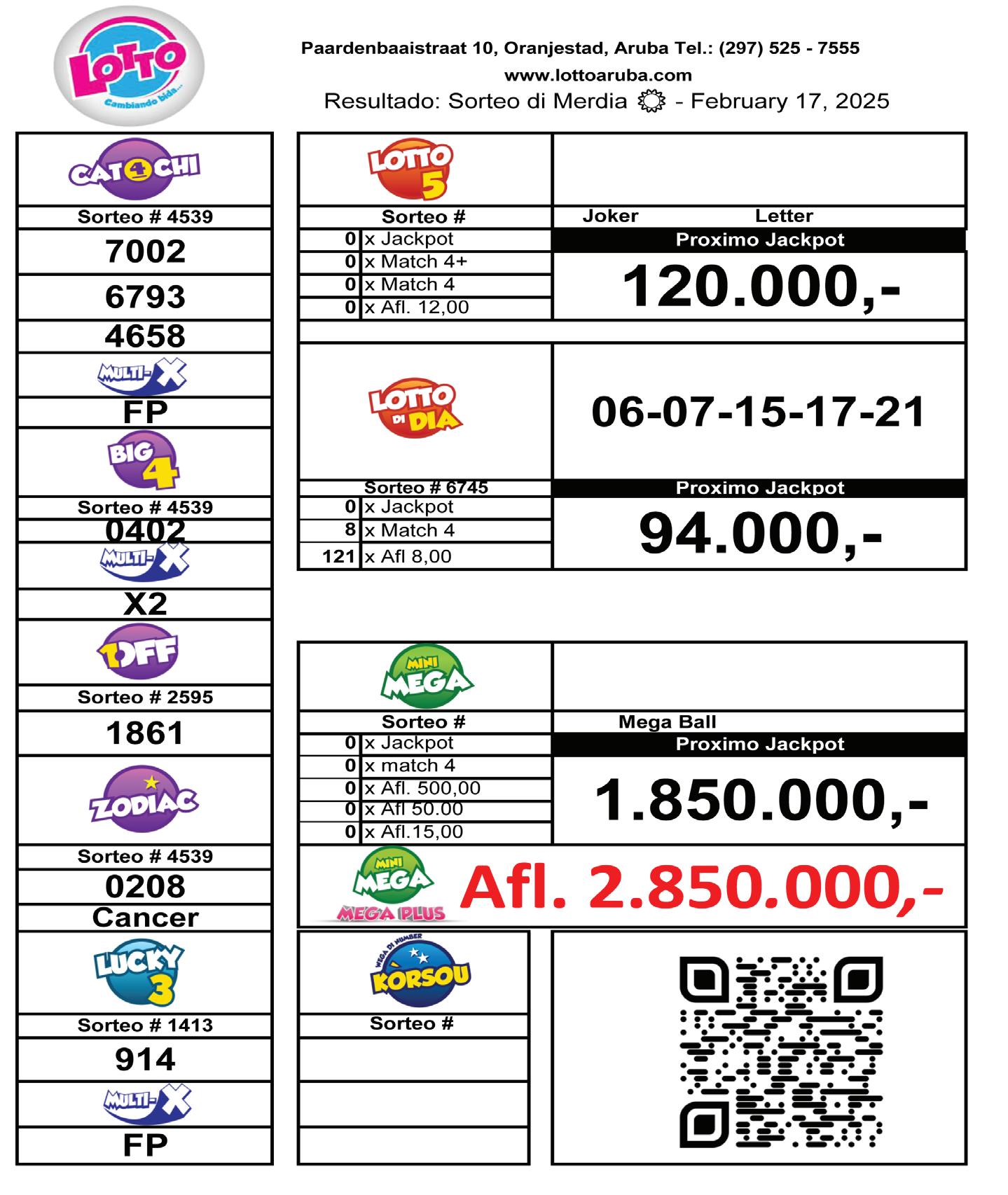 Big 4, 1-OFF, Zodiac, Wega di Number di Korsou di Lotto, Lucky 3, Multi-X, Lotto di Dia, Lotto 5, Mini Mega y cu su Mega Plus y e diferente weganan di Raspa y Gana y Instacash.