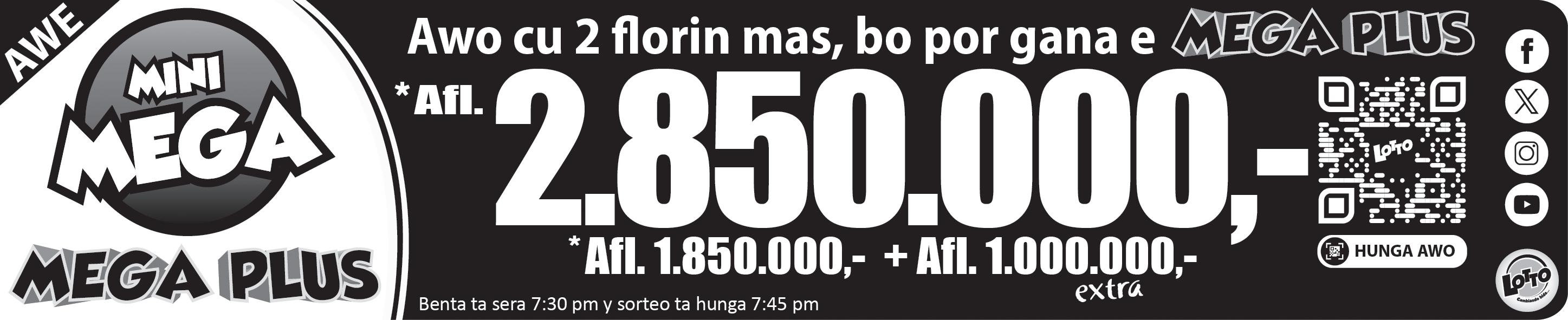 2 florin mas, bo por gana e jackpot di 1 miyon florin extra cu ta pone e suma bira un total di 2 miyon 850 mil florin!