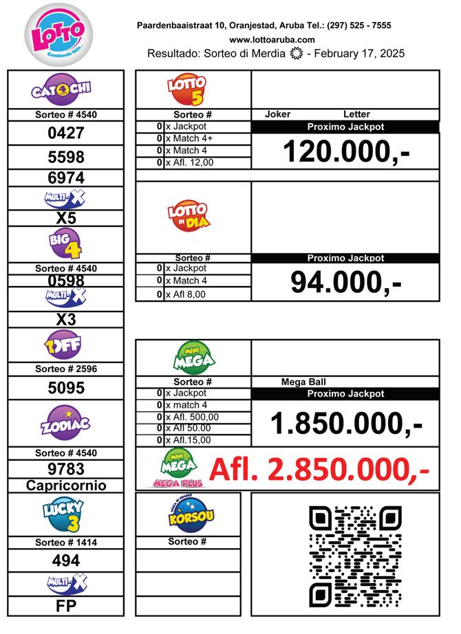 Pa awe 18 di februari Mini Mega su jackpot a bira 1 miyon 850 mil florin y cu