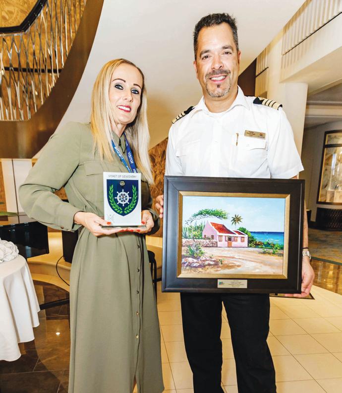 Durante di e ceremonia, por a conta cu presencia di Monica Bos – Cruise Manager di Aruba Tourism Authority (A.T.A.), Mario Arends – Chief Commercial Officer di Aruba Ports Authority (APA), y miembronan di Caribbean Port Agencies cu a yuda na facilita e bishita di e barco crucero.