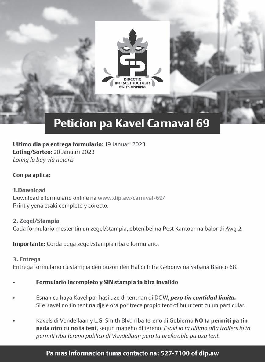Un recordatorio pa tur campadornan cu e ultimo dia pa haci peticion pa campa ta dia 15 maart 2023. Sigui tur reglanan y pasa un dushi temporada. Nos di Cuerpo Policial Aruba lo controla durante campamento na tur parti di nos isla.