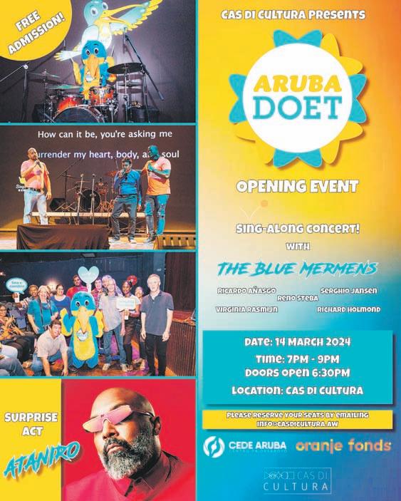 Riba diahuebs, 14 di maart 2024 tur boluntario di Aruba Doet y pueblo di Aruba henter ta invita pa un anochi yena cu musica y canto. E concierto ta cuminsa 7’or di anochi den e auditorium (sala grandi) di Cas di Cultura y entrada ta completamente gratis. Pa reserva lugar mester manda un e-mail na info@casdicultura.aw. E banda musical “The Blue Mermens” lo habri e anochi cu ritmo y ambiente di Virginia Rasmijn, Reno Steba,