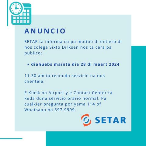 Recientemente SETAR a haci un donacion na Aruba Scholarship Foundation pa brinda nos studiantenan cu ta bay studia na Merca, Canada of den region e oportunidad pa ricibi un beca. Cu e donacion aki, SETAR ta compromete su mes cu e enseñansa di nos hobennan y e crecemento profesional di nos studiantenan cu ta nos futuro profesionalnan.