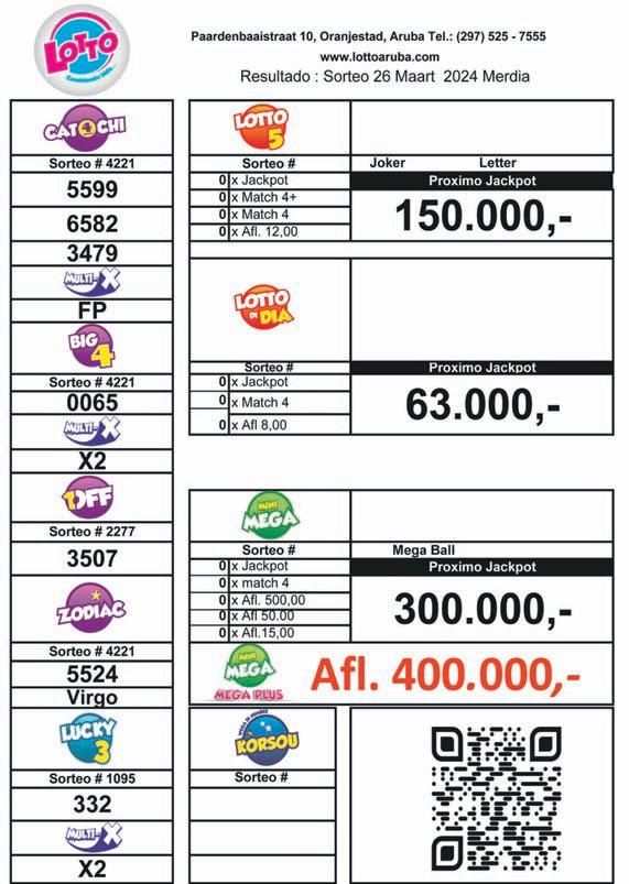 Encuentro hopi satisfactorio cu bo famia. Bo imaginacion lo saca bo di problema financiero. P’e bienestar di tur, percura pa relaha na trabao. Lo bo haya dolor na bo pianan. Number di suerte: 88, 56, 9.