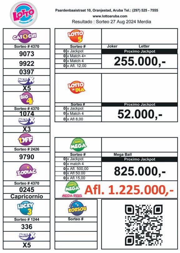 28 di augustus, 2024: Pa motibo cu e Luna di Locura den temporada di vakantie tabata tan gusta, Luna di Locura cu Lotto 5 ta wordo extendi cu un luna mas y lo continua den luna di september tambe! Luna di september tambe ta bira un Luna di Locura cu Lotto 5! Cu cada compra di 2 set di number di Lotto 5 riba e mesun ticket, bo ta ricibi un ticket di Lotto 5 loco completamente gratis ariba mesun ticket.
