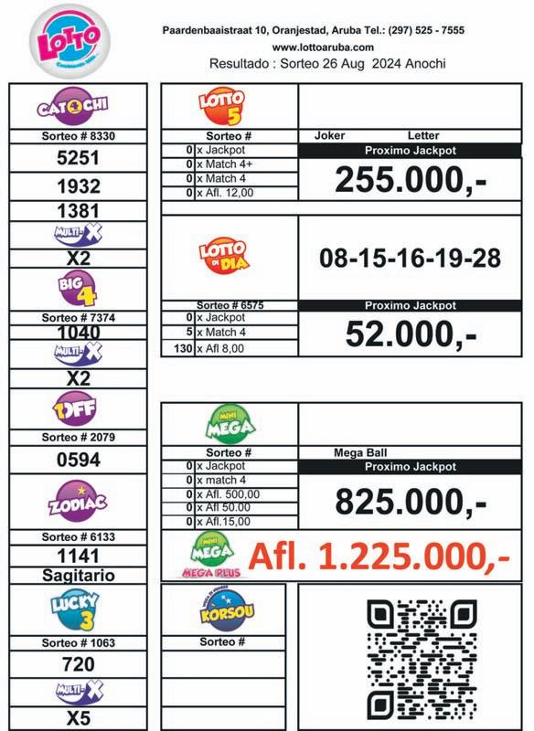 Lotto, E Loteria di Aruba tin diferente wega, Catochi, Big 4, 1-OFF, Zodiac, Wega di Number di Korsou di Lotto, Lucky 3, Multi-X, Lotto di Dia, Lotto 5, Mini Mega y cu su Mega Plus y e diferente weganan di Raspa y Gana y Instacash. Tambe lo por hunga