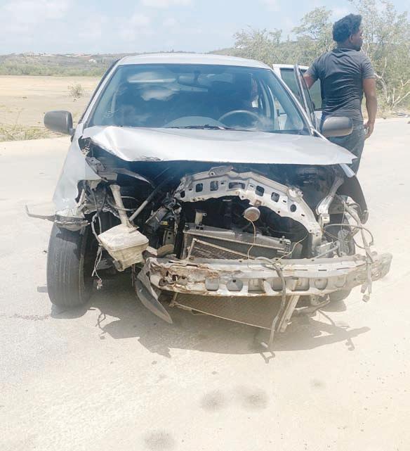 entre un Toyota Yaris y un Honda, ambos auto a keda riba memey caminda. Presencia di polis a wordo pidi na e sitio, mirando cu ambos auto a keda para ariba caminda.