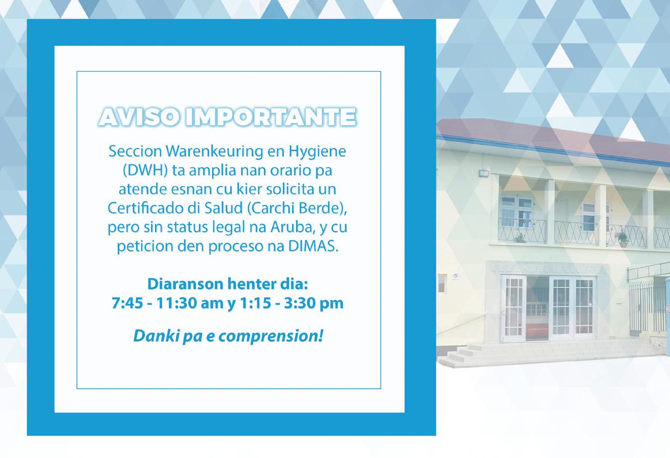 ORANJESTAD, Aruba – 14 de abril de 2026: El Departamento de Salud Pública, a través de su sección de Inspección de Alimentos e Higiene (DWH), informa que ha ampliado su horario para atender a personas que solicitan un certificado de salud (tarjeta verde) pero que no tienen estatus legal en Aruba y cuya petición se encuentra actualmente en proceso en DIMAS.