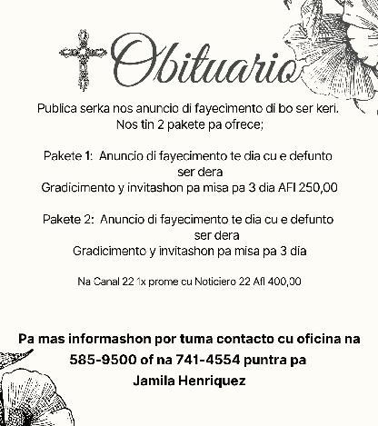 ORANJESTAD - Diabierna 03 april 2026 ‘Bierna Santo’ y dialuna 06 april 2026 ‘di dos dia di Pasco di Resureccion’ ta considera como dianan oficial di fiesta of dianan conmemorativo segun art. 22 di e Ordenansa Laboral 2013.