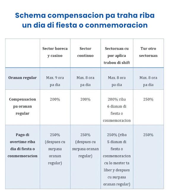 Pa sectornan horeca, casino y continuo (companianan cu ta traha 24/7- conoci como ‘traha warda’) un dia di fiesta o conmemoracion por ta un dia normal di trabou. Den caso cu e trahado ta riba schedule pa traha riba e dia aki e tin derecho riba 200% di su salario. Si riba e dia aki e trahado traha mas cu su oranan regular (pa sector horeca/casino esaki ta 9 ora y pa sector continuo ta 8 ora) ley ta considera cu e trahado ta traha overtime riba un dia di fiesta o conmemoracion y e tin derecho riba 250% pa e oranan extra.