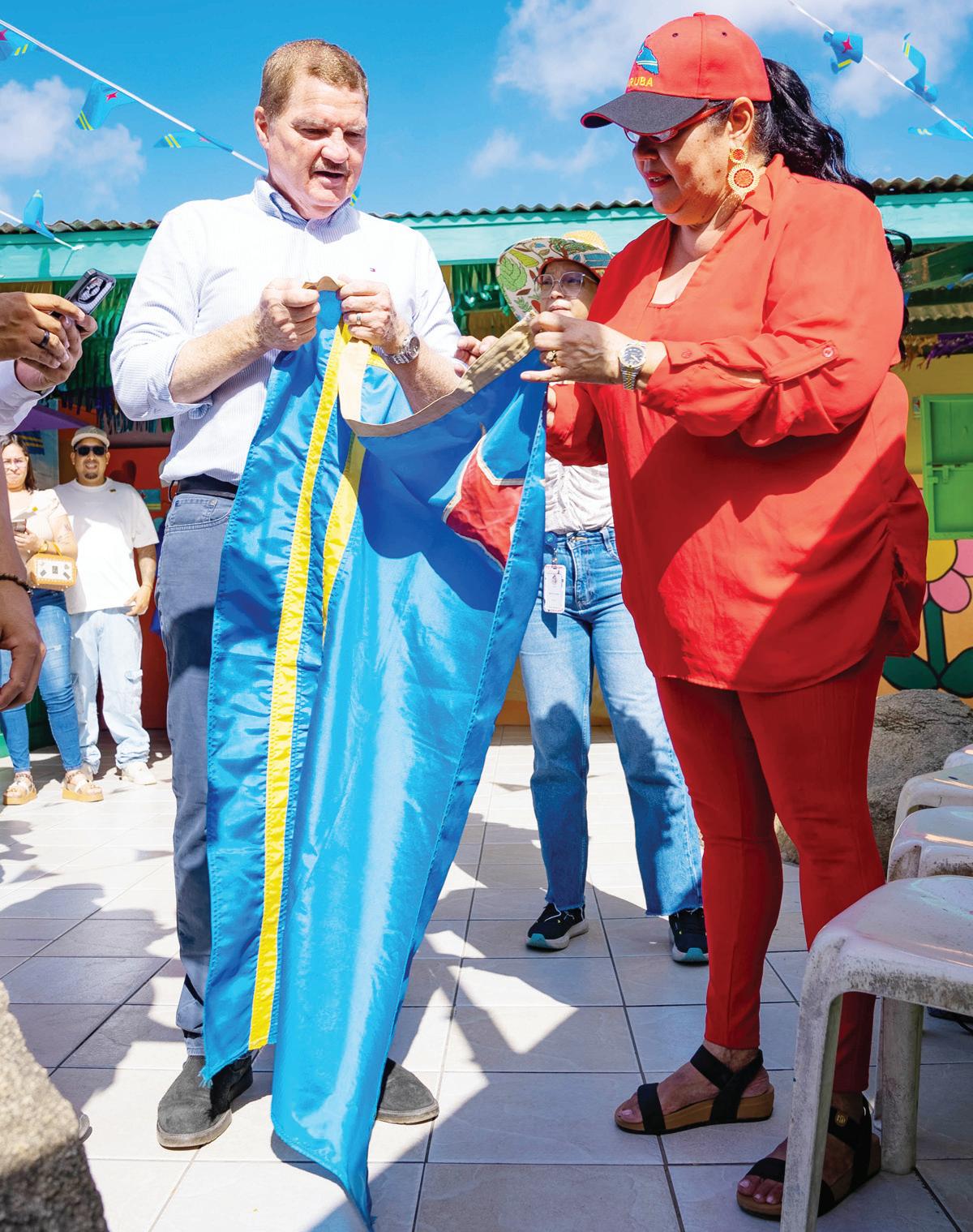 Tambe a tuma lugar un momento significativo na Scol Mi Preti Wowo, caminda Prome Minister Mike Eman hunto cu representante di e scol, Sra. Koolman, a participa den hisamento simbolico di Bandera di Aruba, resaltando e importancia di inculca desde edad hoben, amor pa Aruba y respet pa su simbolonan nacional.