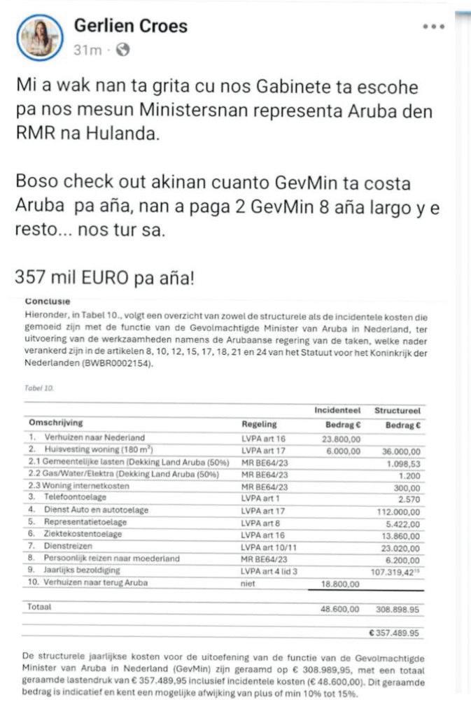 “Prome pueblo a wordo bisa cu no por nombra un GevMin pasobra ta caro. Cu pa spaar placa, Minister Gerlien Croes mes lo biaha cada luna bay Hulanda. Awo a resulta cu Aruba toch a nombra un GevMin. Esaki ta mustra cu pueblo a wordo gaña pa Gerlien cu e argumento di costo halto,” Parlamentario Maduro ta expresa.