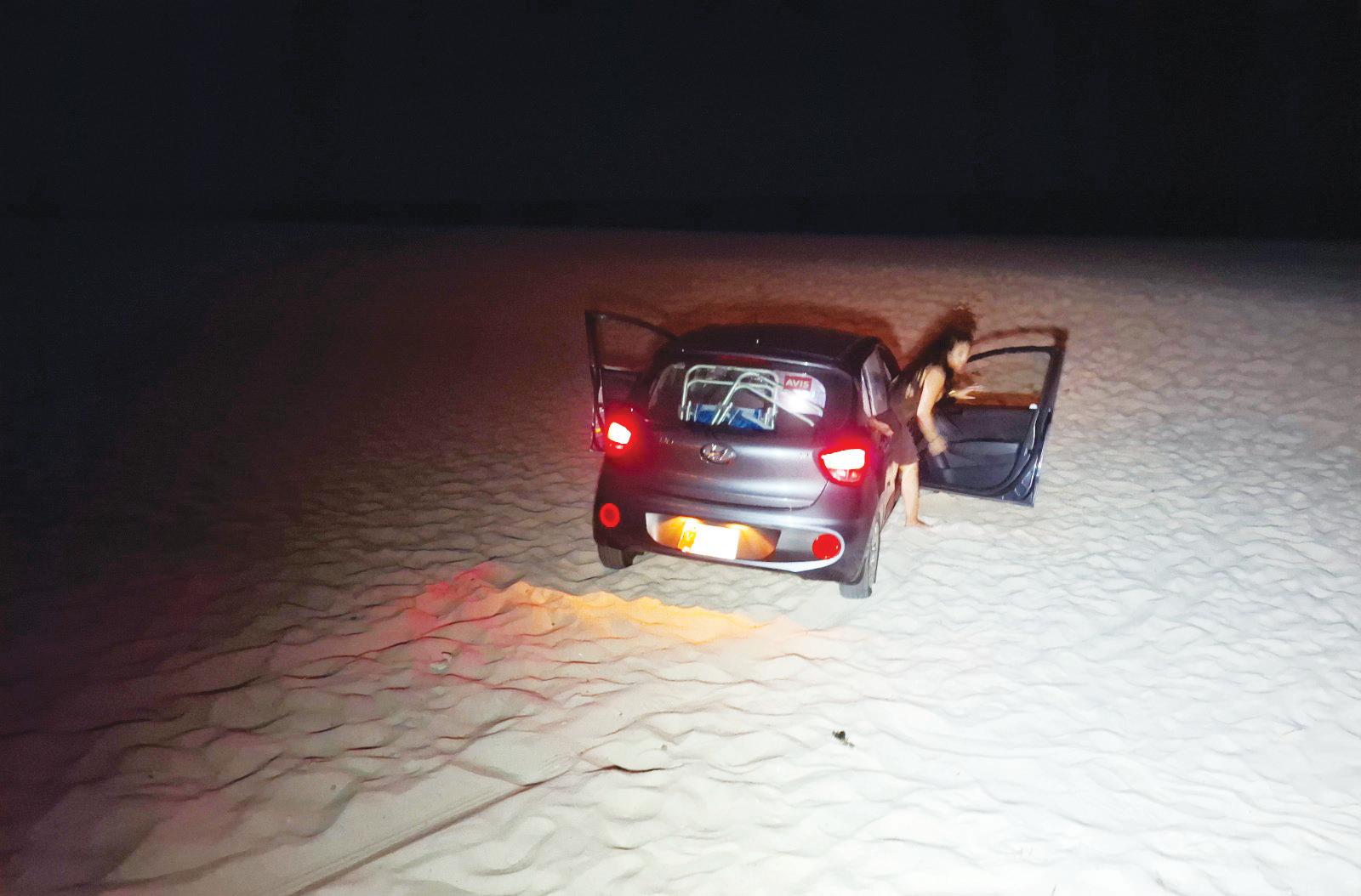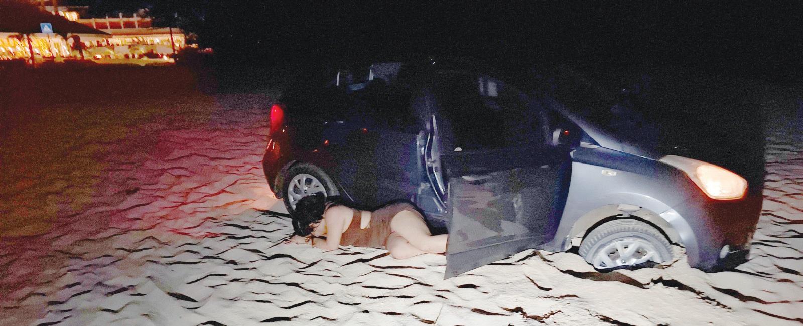 Diasabra madruga durante patruya polis a bin topa un pareha turista cu un auto di huur pega den e santo blanco na Eagle Beach, mesora polis a para baha bay atende cu nan. A bin resulta cu e pareha no tabata sa cu esaki ta prohibi y a core un parti riba e santo blanco te cu nan chok.