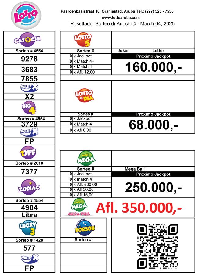 – 4 di maart, 2025: Diabierna anochi 28 di februari tabata tin e sorteo miyonario tan espera di Mini Mega y Mega Plus cu e jackpot record di 4 miyon 350 mil florin. E numbernan ganado cu a sali e anochi ey ta: 05-1129-30 y e Mega Ball: 03 y manera e resultado a wordo procesa a bin haya sa cu tin 1 solo ticket ganado cu a gana e jackpot completo di Mini Mega y Mega Plus di 4 miyon 350 mil florin y a wordo bendi na Mahuma Lottery & Snack.