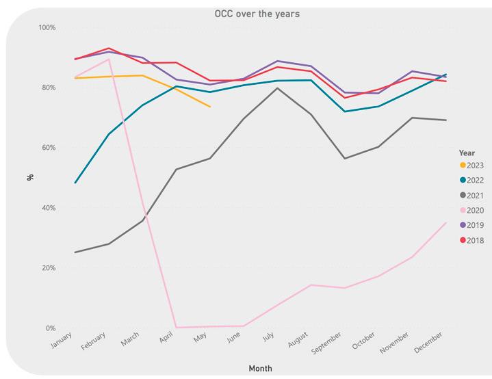 Proyeccion actual pa ocupacion averahe di hotel pa Juni ta 71%, pa Juli ta 75%, y pa Augustus ta 73%. Expectativa pa ocupacion averahe di ful aña 2023 to 74%, cual ta representa un reduccion di 12% compara cu e averahe di aña 2019. Mientras cu recuperacion tabata fuerte den prome lunanan di 2023, por constata comienso di menos demanda den reservacion pa e ultimo lunanan di aña.