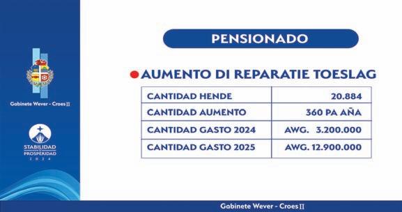 1400 persona cu ta ricibi "gehandicapten uitkering", y e aumento cu nan lo ricibi lo ta di 1,560-florin pa aña. E gastonan di Gobierno pa duna e alivio aki ta di 1.4 miyon florin pa 2024, y 3 miyon pa 2025. Gabinete Wever-Croes ta y lo sigui