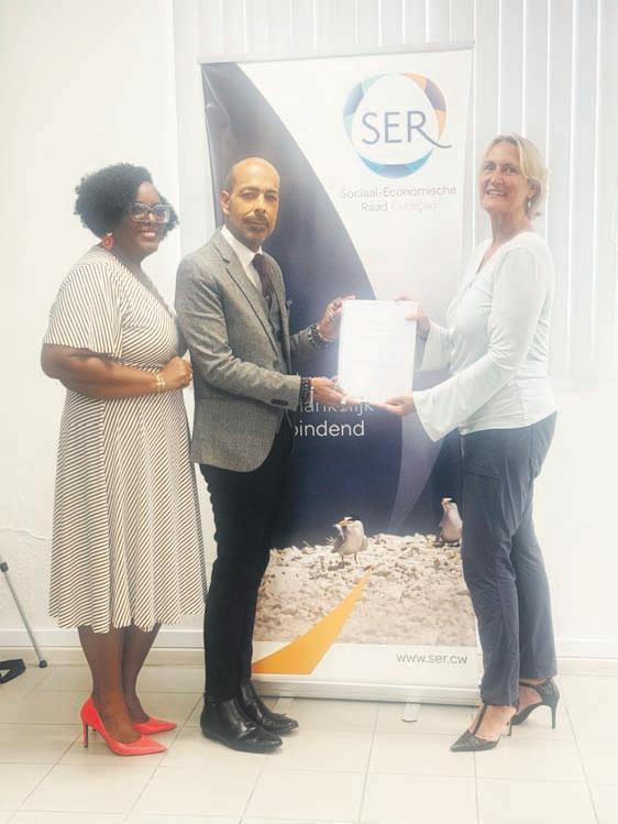 E rapòrt, mas aleu, ta suprayá e importansia di yega na solushonnan ku ta adaptá na e konteksto kultural di Kòrsou. E ta rekomendá, entre otro, kreashon di mekanismonan pa denunsiá aktonan no deseabel di forma independiente i aksesibel, i tambe asignashon di asesornan konfidensial ku por ofresé un kanal sigur pa empleadonan por reportá insidentenan. Ademas, e informe ta boga pa implementashon di un kuadro legal mas estrikto pa sigurá ku empresanan i organisashonnan ta obligá pa promové un ambiente laboral sigur i solidario. Riba e portrèt: Momento di entrega di e rapòrt. Di man robes pa drechi Sra. Sharlyn Curial-Villarreal, Sr. Raul Henriquez i Sra. Karin Bosman