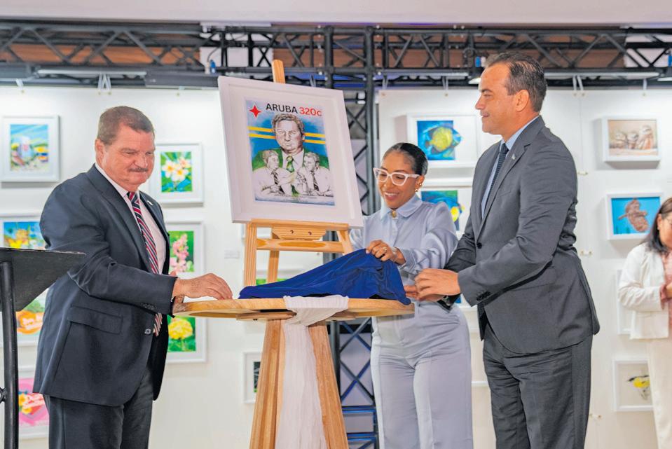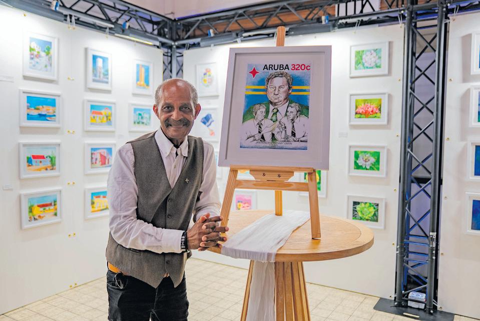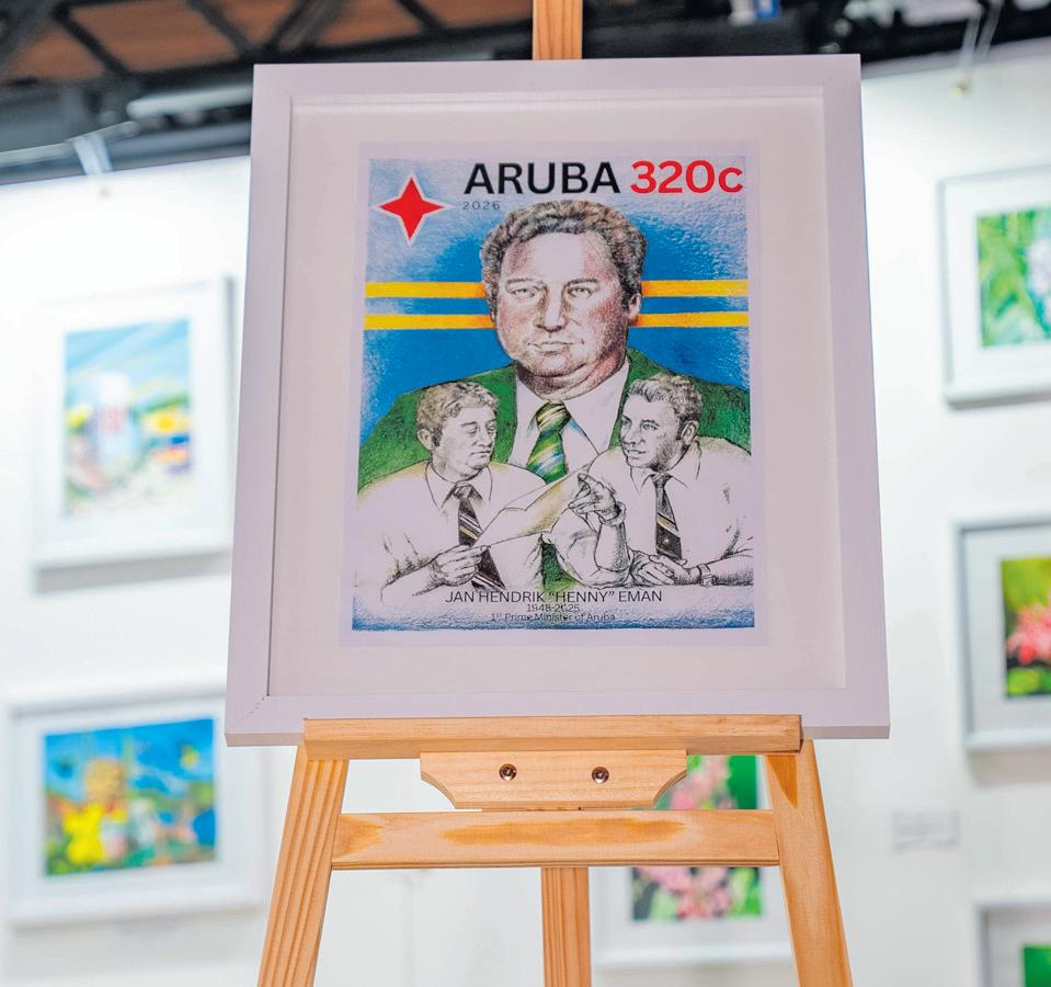 Estampia conmemorativo dedica na Henny Eman, prome Minister President di pais Aruba, no ta solamente un representacion visual, sino un interpretacion profundo di su caracter y legado, segun artista Nigel Matthews, responsabel pa e diseño.